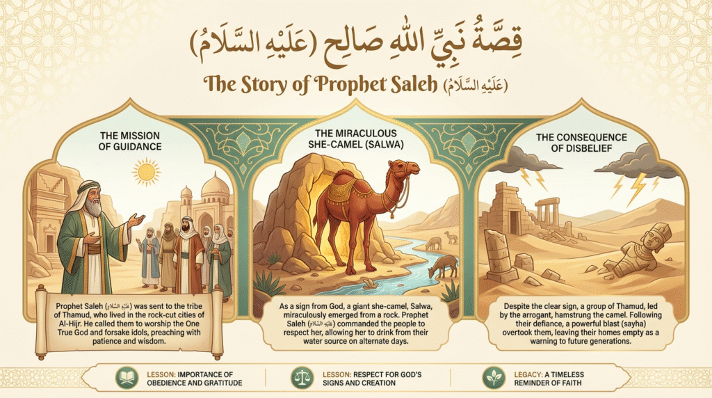 The complete story of Prophet Saleh and the Tribe of Thamud. Discover the miracle of the She-Camel, the theological ultimatum shared with Prophet Jesus, and the prophetic etiquette for visiting the ruins of Madain Saleh today.